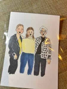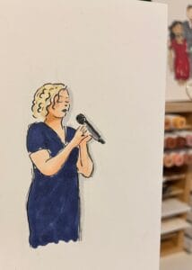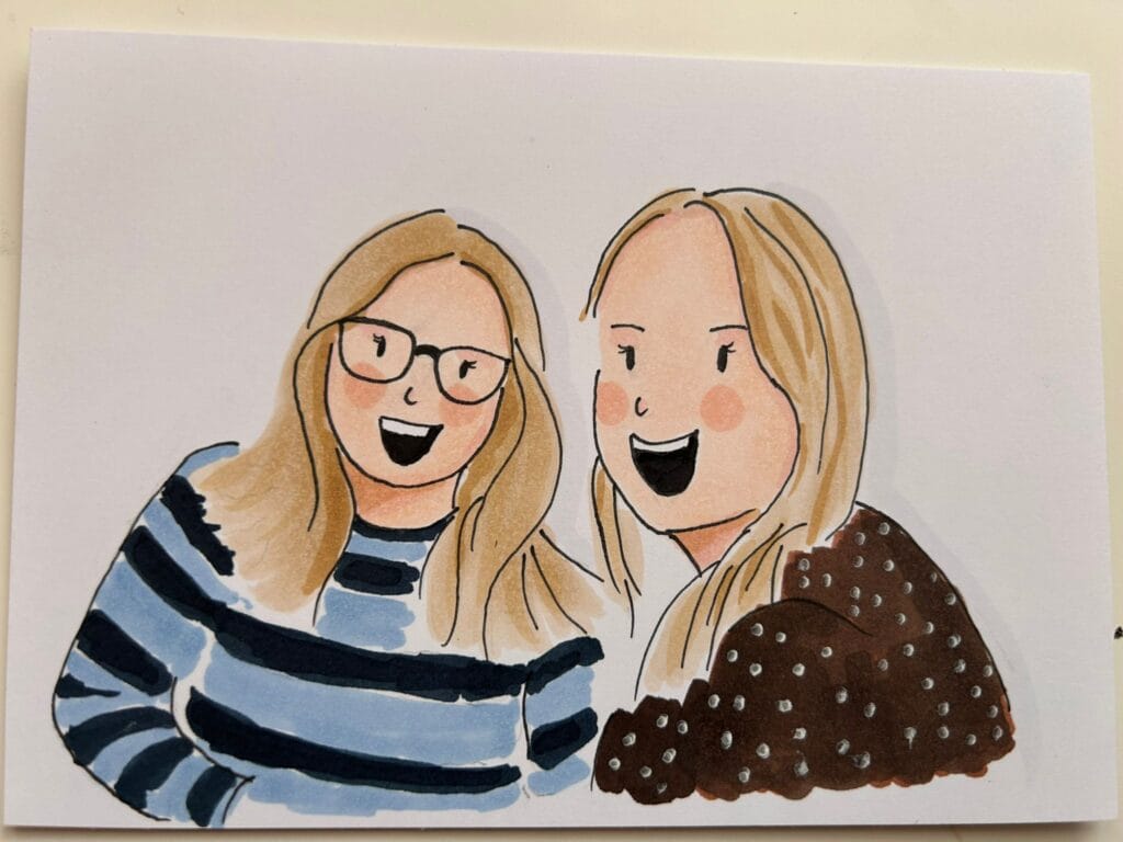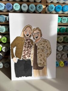 Lang stilzitten hoeft niet! Ik maak foto’s van de gasten en teken ze vervolgens met fineliners en alcoholmarkers op stevig papier. Ik focus me op de details van de kleding, sieraden, accessoires en het haar. Zo herkennen mensen zichzelf meteen in de portretjes. Als ze klaar zijn, gaan de portretjes in een foliezakje en kunnen de gasten hun portretje meenemen.