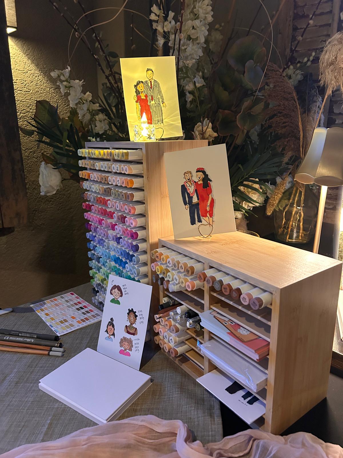 Ter plekke maak ik snelle portretjes waarin de gasten zich herkennen aan houding, haar, outfit en accessoires. De portretjes maak ik met fineliner en alcoholmarkers, waardoor je mooie diepe kleuren krijgt.
